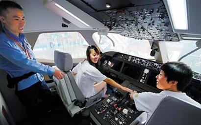 鄉村教師孫云霞、孫鳳霞在國產(chǎn)大飛機樣機機艙內體驗駕駛操作。 徐瑞哲 攝