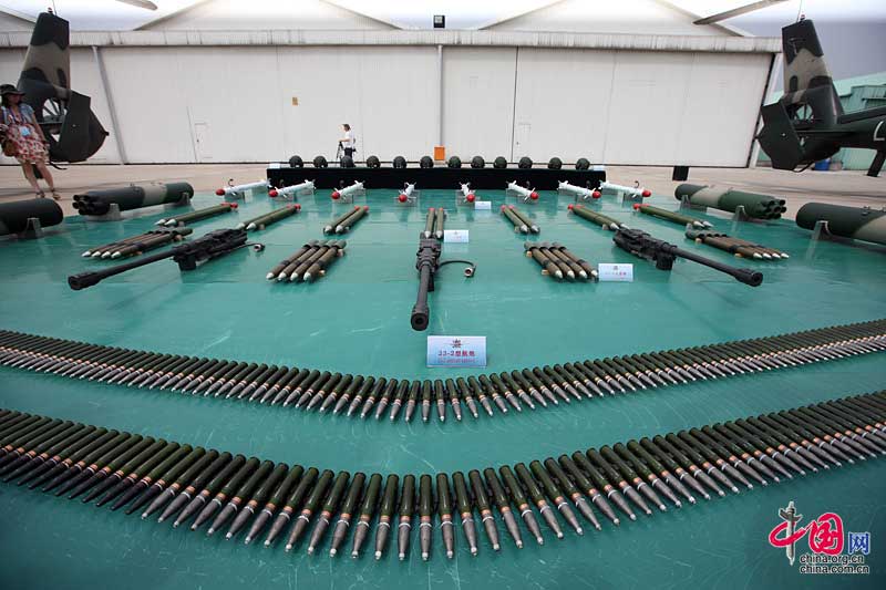 靜態(tài)展示區展示直9-WZ武裝直升機的武器裝備和彈藥。 攝影:中國網(wǎng) 楊佳