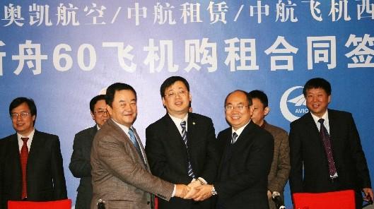 2013年1月18日,奧凱航空與中航國際租賃公司、西安飛機國際航空制造股份有限公司在北京簽署3架新舟60飛機購租合同。奧凱航空總裁劉偉寧;西飛集團公司總經(jīng)理、黨委書(shū)記、中航飛機西飛黨委書(shū)記宋水云;中航租賃總經(jīng)理趙宏偉等領(lǐng)導在購租合同上簽字。