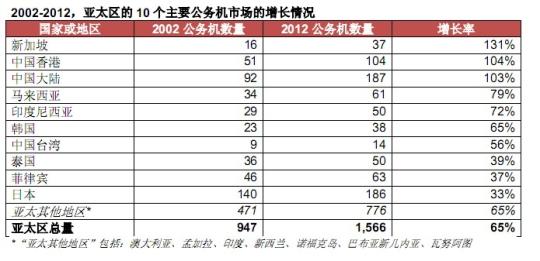 2002-2012,亞太區的10個(gè)主要公務(wù)機市場(chǎng)的增長(cháng)情況