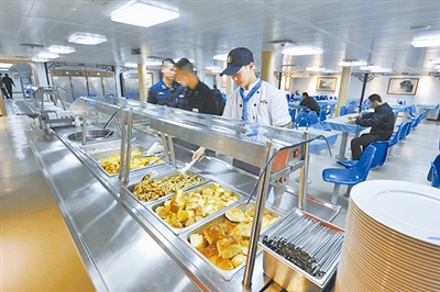 適應航母全時(shí)工作理念,航母餐廳在正餐基礎上設置了間餐,提供糕點(diǎn)、水果飲料等,保證了艦員隨時(shí)能吃到可口的食品。