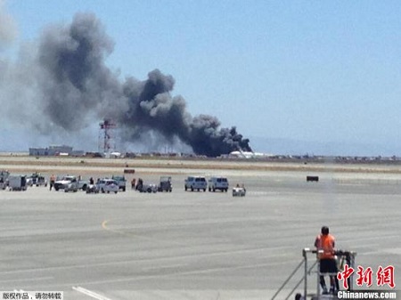 一架韓亞航空公司的波音777型客機當地時(shí)間7月6日11點(diǎn)半在美國舊金山國際機場(chǎng)著(zhù)陸時(shí)失事,機尾折斷,引發(fā)大火,并導致數十人傷亡。圖為失事現場(chǎng)濃煙滾滾。