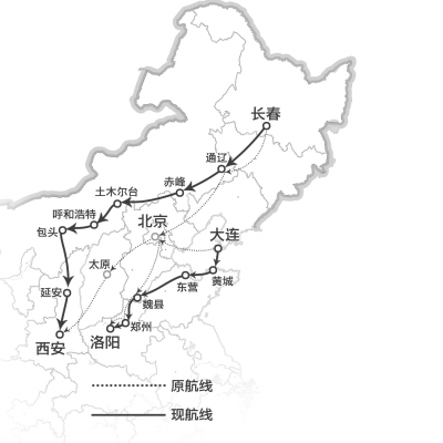 具體方案為:上述航線(xiàn)均繞開(kāi)北京上空,其中3條向西的航線(xiàn)飛經(jīng)內蒙古的土木爾臺、呼和浩特、包頭抵達西北、西南地區;4條向南的航線(xiàn)飛經(jīng)大連、青島抵達中南地區。比如,原大連—北京—魏縣—鄭州/洛陽(yáng)航線(xiàn)調整為大連—黃城—東營(yíng)—魏縣—鄭州/洛陽(yáng)(注:中間僅為航班經(jīng)過(guò)地點(diǎn)不停。)。