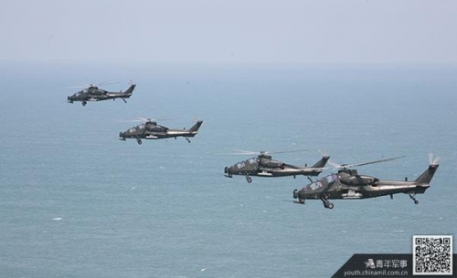 中國陸航武直-10進(jìn)行海上編隊超低空突防演練。(司啟富攝)