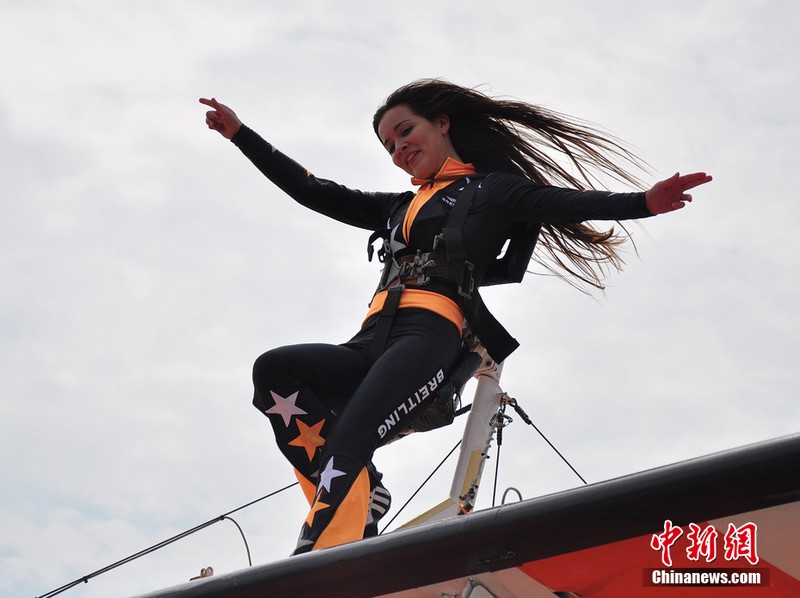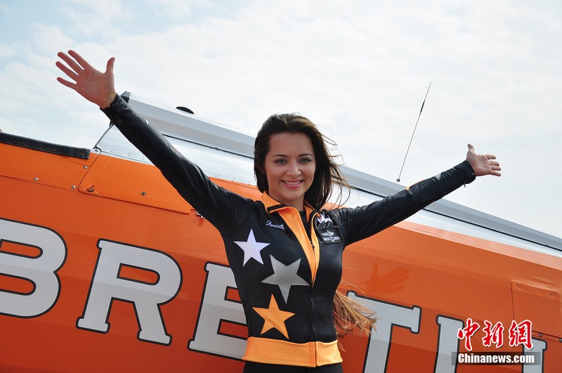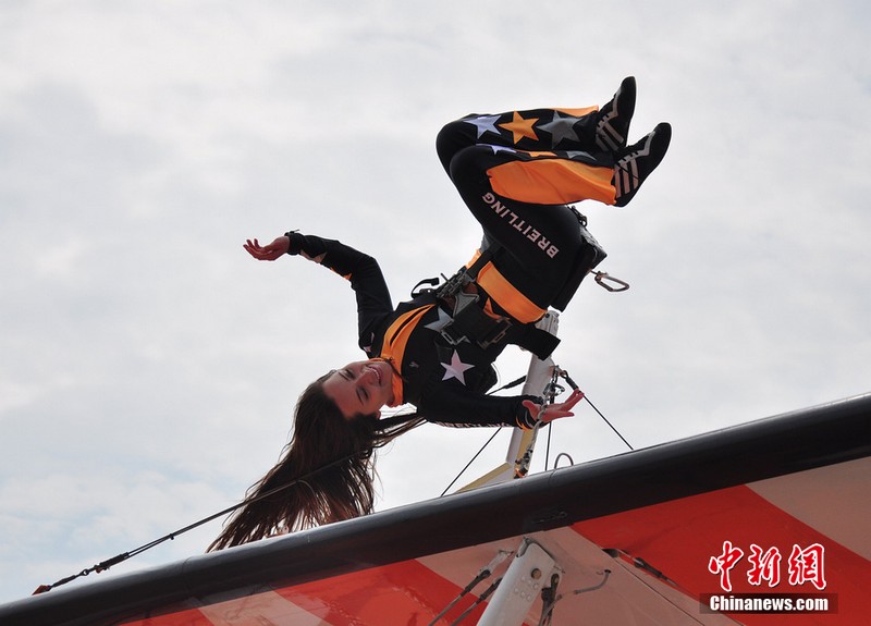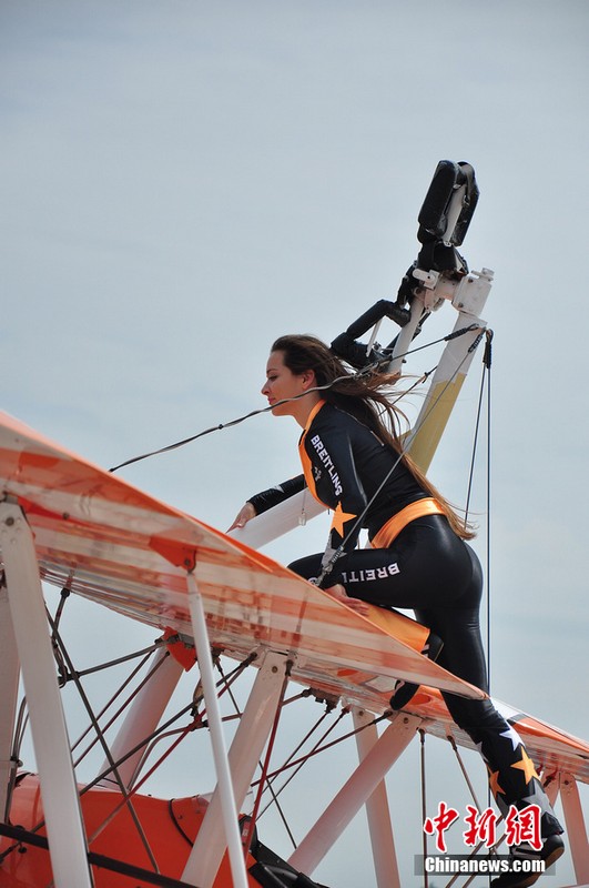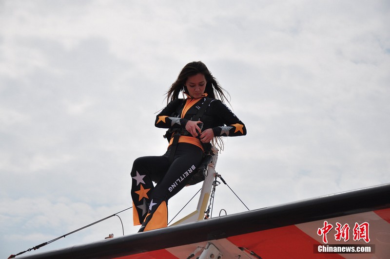 11月11日,歐洲“百年靈”機翼行走飛行表演隊的美女表演者在地面停放的飛機上進(jìn)行了表演動(dòng)作展示。
