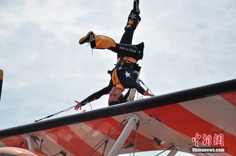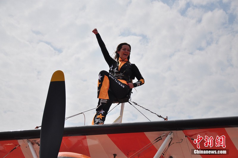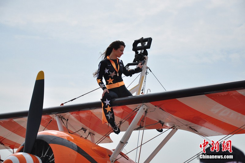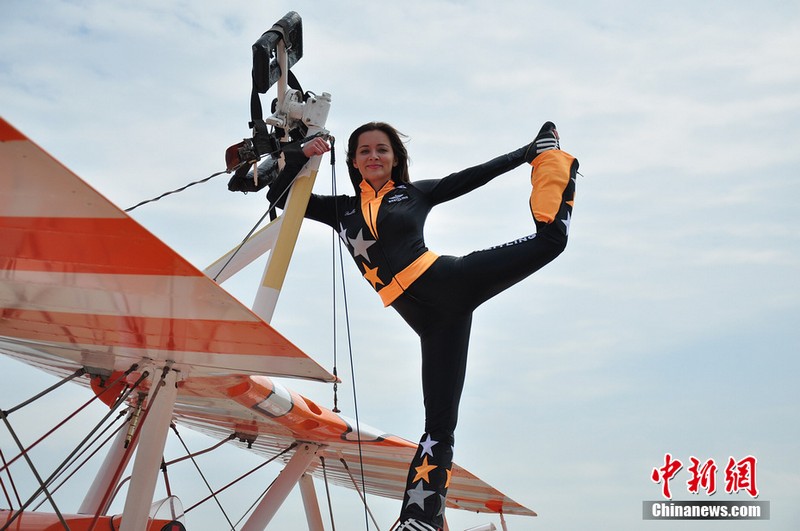 機翼上的芭蕾:美女特技演員機翼上跳舞
