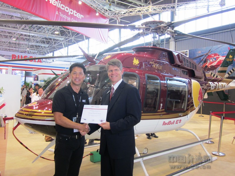 中國經(jīng)濟網(wǎng)珠海航展特派記者團訊 著(zhù)名演員兼明星飛行員王敏德獲得貝爾直升機公司總裁兼首席執行官約翰·加里森頒發(fā)“貝爾直升機中國大使”證書(shū)。王敏德將代表貝爾直升機公司出席各類(lèi)活動(dòng)。王敏德是一名合資格的飛行員, 持有貝爾直升機飛行執照。