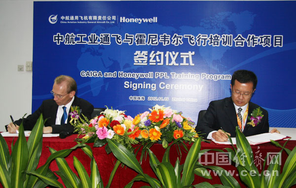 中國經(jīng)濟網(wǎng)珠海航展特派記者團 記者王飛11月16日報道 15日,中航通用飛機有限責任公司(以下簡(jiǎn)稱(chēng)“中航工業(yè)通飛”)副總經(jīng)理、珠海中航飛行學(xué)校有限公司董事長(cháng)沙長(cháng)安與霍尼韋爾航空航天(簡(jiǎn)稱(chēng)“霍尼韋爾公司”)亞太區總裁Briand Greer簽署了“飛機5用駕駛員駕照(PPL)項目合作備忘錄”。這標志著(zhù)中航工業(yè)通飛下屬的珠海中航飛行學(xué)校向霍尼韋爾公司的工程技術(shù)人員和管理人員提供飛行培訓服務(wù)的工作進(jìn)入實(shí)施階段。