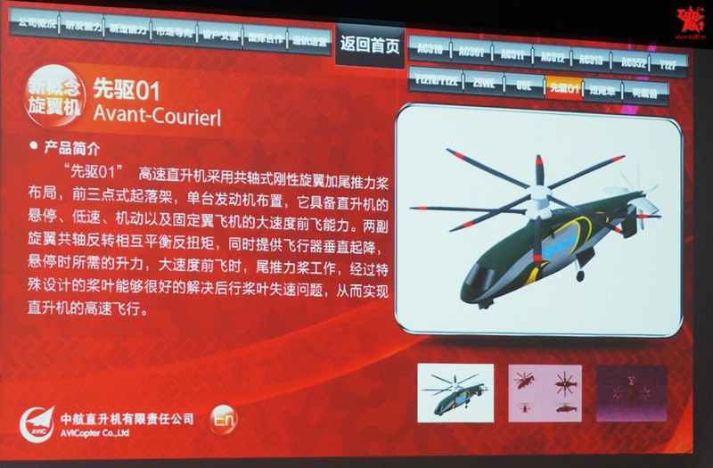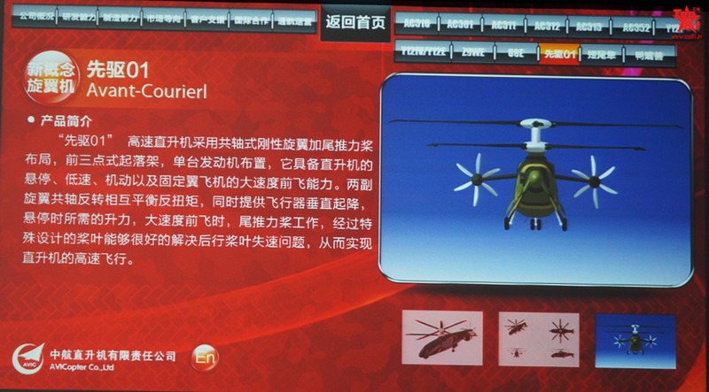 人民網(wǎng)北京11月9日電 (記者 楊鐵虎)中航工業(yè)直升機公司將在第九屆中國航展上展出“先驅01”新概念高速直升機模型。9日下午,中航工業(yè)直升機公司的專(zhuān)家向人民網(wǎng)記者介紹說(shuō),“先驅 01”新概念高速直升機采用共軸式剛性旋翼加尾推力槳布局,前三點(diǎn)式起落架,單臺發(fā)動(dòng)機布置。具備直升機的懸停、低速、機動(dòng)以及固定翼飛機的大速度前飛能力。
