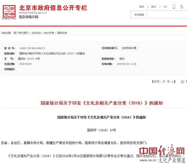 國家統計局關(guān)于印發(fā)《文化及相關(guān)產(chǎn)業(yè)分類(lèi)(2018)》的通知