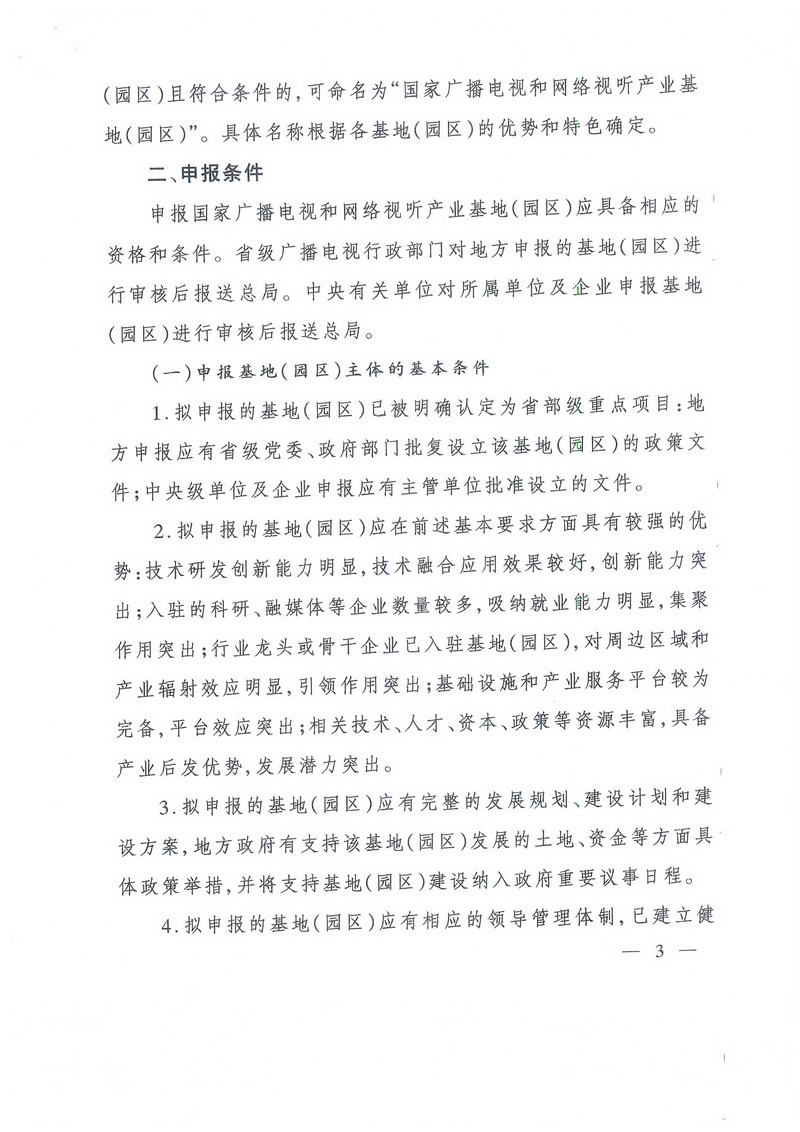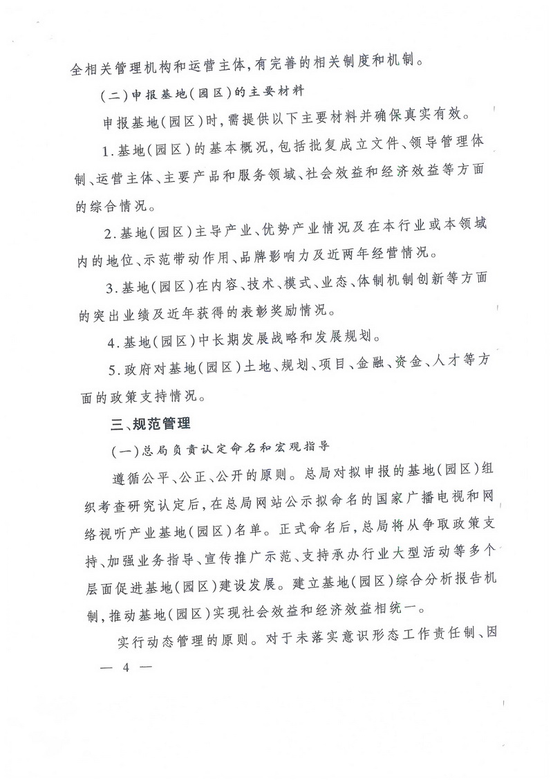 對總局此前已經(jīng)命名的基地(園區),屬于廣播電視和網(wǎng)絡(luò )視聽(tīng)方面的,要進(jìn)行全面梳理,按本通知精神納入統籌管理,推動(dòng)轉型升級,并按上述時(shí)間要求報送年度發(fā)展情況報告。