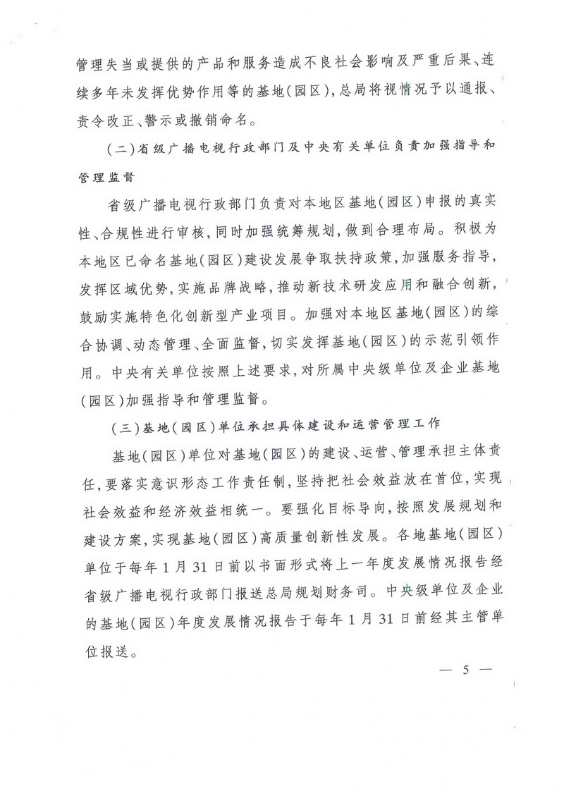 基地(園區)單位對基地(園區)的建設、運營(yíng)、管理承擔主體責任,要落實(shí)意識形態(tài)工作責任制,堅持把社會(huì )效益放在首位,實(shí)現社會(huì )效益和經(jīng)濟效益相統一。要強化目標導向,按照發(fā)展規劃和建設方案,實(shí)現基地(園區)高質(zhì)量創(chuàng )新性發(fā)展。各地基地(園區)單位于每年1月31日前以書(shū)面形式將上一年度發(fā)展情況報告經(jīng)省級廣播電視行政部門(mén)報送總局規劃財務(wù)司。中央級單位及企業(yè)的基地(園區)年度發(fā)展情況報告于每年1月31日前經(jīng)其主管單位報送。