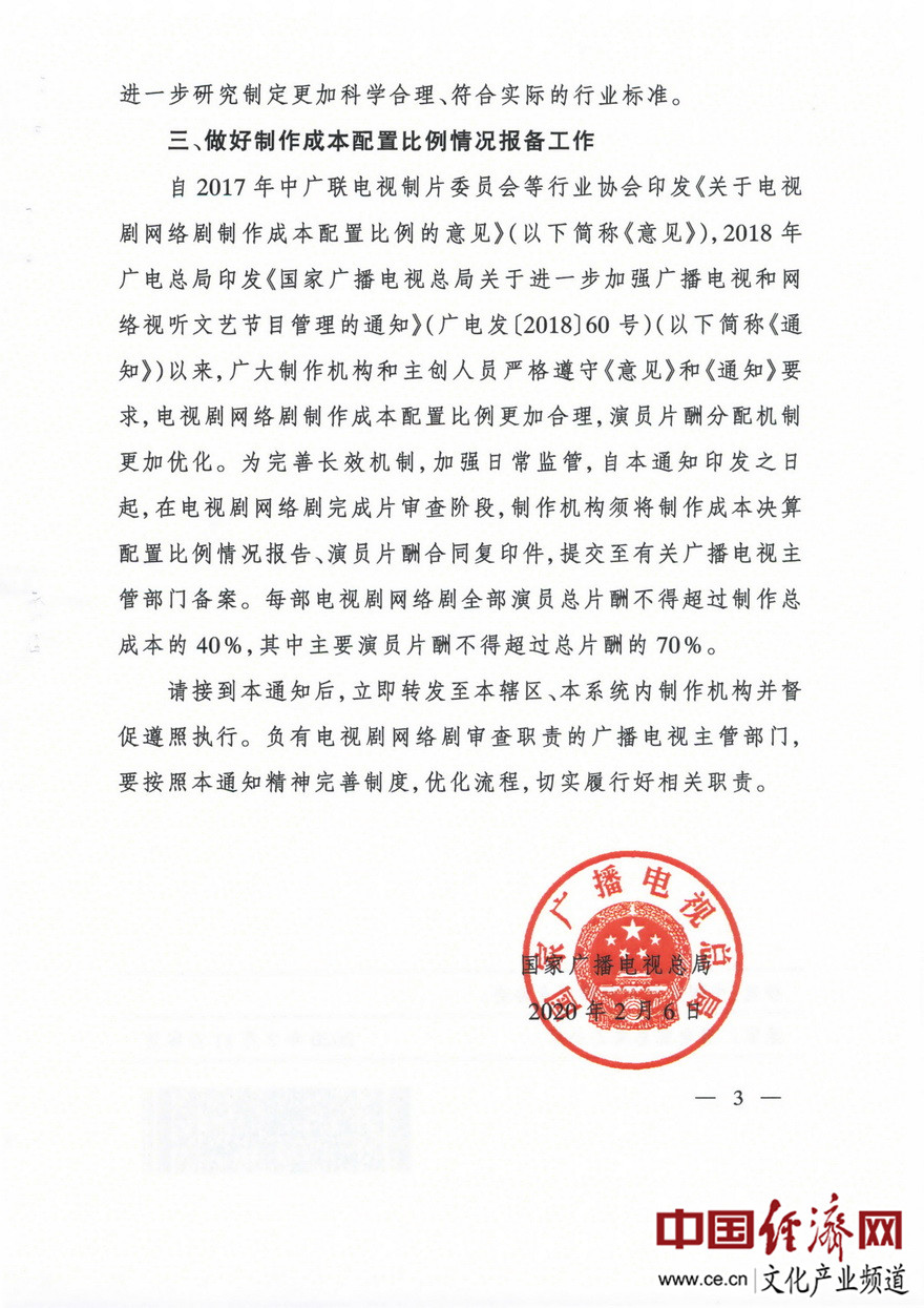 經(jīng)濟日報-中國經(jīng)濟網(wǎng)北京2月20日訊 近日,國家廣播電視總局下發(fā)了《進(jìn)一步加強電視劇網(wǎng)絡(luò )劇創(chuàng )作生產(chǎn)管理有關(guān)工作的通知》(廣電發(fā)﹝2020﹞10號)。據經(jīng)濟日報-中國經(jīng)濟網(wǎng)文化產(chǎn)業(yè)頻道(微信號:cewenhua)了解,該《通知》要求:一是加強源頭引導,在申報備案公示時(shí),制作機構須向省局承諾已基本完成劇本創(chuàng )作;二是反對內容“注水”,電視劇網(wǎng)絡(luò )劇拍攝制作提倡不超過(guò)40集,鼓勵30集以?xún)榷虅?chuàng )作;三是做好制作成本配置比例情況報備工作。在電視劇網(wǎng)絡(luò )劇完成片審查階段,制作機構須將制作成本決算配置比例情況報告、演員片酬合同復印件,提交至省局備案。每部電視劇網(wǎng)絡(luò )劇全部演員總片酬不得超過(guò)制作總成本的40%,其中主要演員片酬不得超過(guò)總片酬的70%。>>>更多政策可查看中國經(jīng)濟網(wǎng)“中國文化產(chǎn)業(yè)政策庫”