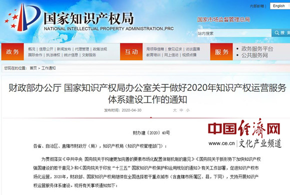 財政部辦公廳 國家知識產(chǎn)權局辦公室關(guān)于做好2020年知識產(chǎn)權運營(yíng)服務(wù)體系建設工作的通知