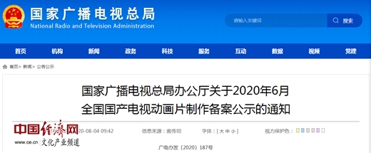 經(jīng)濟日報-中國經(jīng)濟網(wǎng)北京8月5日訊 中國經(jīng)濟網(wǎng)文化產(chǎn)業(yè)頻道記者從國家廣播電視總局官網(wǎng)獲悉,《國家廣播電視總局辦公廳關(guān)于2020年6月全國國產(chǎn)電視動(dòng)畫(huà)片制作備案公示的通知》(簡(jiǎn)稱(chēng)《通知》)于4日發(fā)布?!锻ㄖ访鞔_,2020年6月,經(jīng)備案公示的全國國產(chǎn)電視動(dòng)畫(huà)片為53部,19934分鐘。
