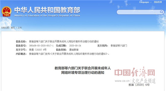 經(jīng)濟日報-中國經(jīng)濟網(wǎng)北京8月27日訊 日前,為營(yíng)造良好安全的未成年人網(wǎng)絡(luò )環(huán)境,教育部、國家新聞出版署、中央網(wǎng)信辦、工業(yè)和信息化部、公安部、市場(chǎng)監管總局等六部門(mén)發(fā)文,聯(lián)合開(kāi)展未成年人網(wǎng)絡(luò )環(huán)境專(zhuān)項治理行動(dòng)。