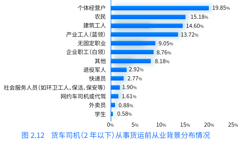 不僅如此,報告中還提到,過(guò)往貨運行業(yè)對傳統行業(yè)從業(yè)者的吸引力較強,多為農民、個(gè)體經(jīng)營(yíng)戶(hù)、產(chǎn)業(yè)工人(藍領(lǐng))、無(wú)固定職業(yè)、建筑工人等群體。而近幾年,轉型從事貨車(chē)司機的職業(yè)還包含了企業(yè)職工(白領(lǐng))、社會(huì )服務(wù)人員、學(xué)生等,另外,外賣(mài)員、快遞員、網(wǎng)約車(chē)司機及代駕司機等新型靈活就業(yè)者也有部分人群選擇轉行成為貨車(chē)司機。