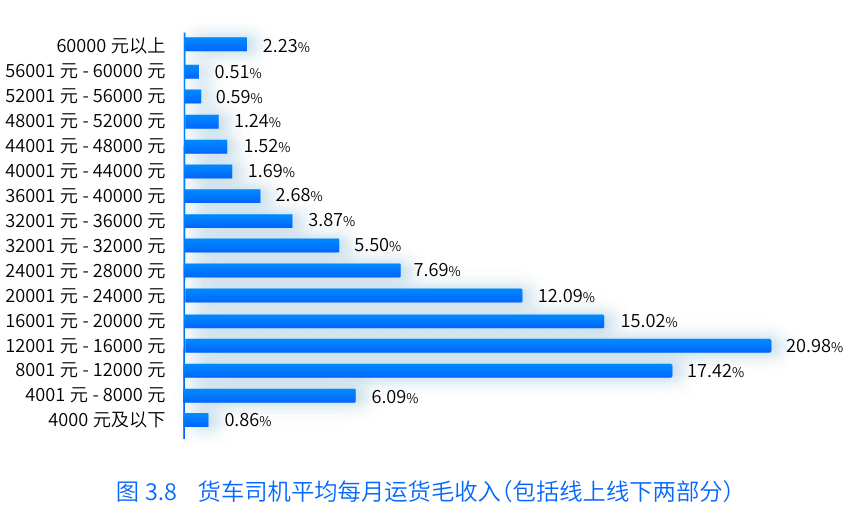 報告中提到,貨車(chē)司機每月毛收入平均值為20441元。在剔除油(電、氣)費、高速費、保險、保養和平臺信息技術(shù)服務(wù)費等成本后,貨車(chē)司機平均月凈收入均值為12063元。