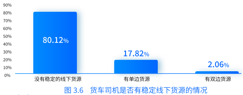 報告中提到,約80.12%的司機沒(méi)有穩定的線(xiàn)下貨源供應,貨車(chē)司機很少能夠掌握穩定線(xiàn)下貨源。大部分司機面臨貨運工作的不穩定性,需要花費大量時(shí)間和精力去尋找和獲取貨源,這不僅降低了他們的運輸效率,也增加了運營(yíng)成本。