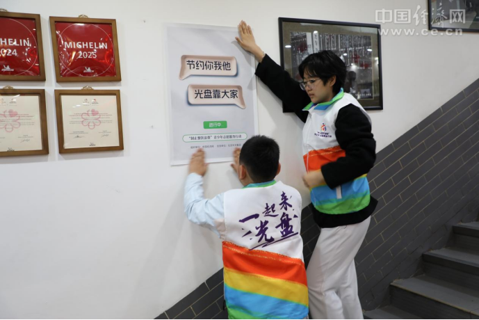 活動(dòng)中,“制止餐飲浪費”青少年志愿者們首先將宣傳節約糧食、反對浪費的標語(yǔ)海報張貼在餐廳顯著(zhù)位置。