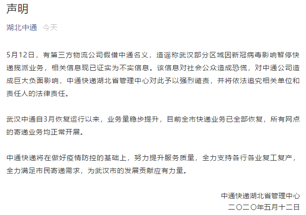 中通快遞湖北省管理中心表示,該信息對社會(huì )公眾造成恐慌,對中通公司造成巨大負面影響,中通快遞湖北省管理中心對此予以強烈譴責,并將依法追究相關(guān)單位和責任人的法律責任。