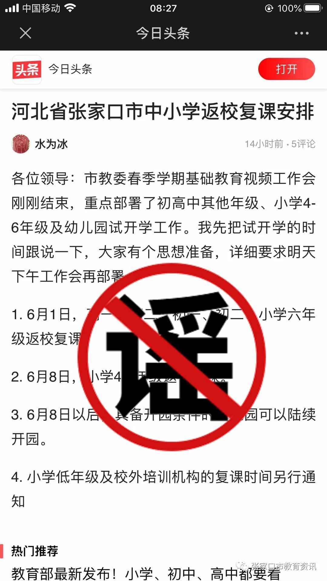 謠言粉碎機二:張家口發(fā)布中小學(xué)返校復課安排,6月8日幼兒園可開(kāi)園?不實(shí)!