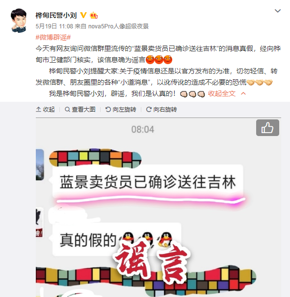 據吉林省樺甸市公安局永吉派出所民警劉剛 @樺甸民警小劉 5月19日消息,經(jīng)向樺甸市衛健部門(mén)核實(shí),網(wǎng)傳“藍景賣(mài)貨員已確診送往吉林”系謠言。