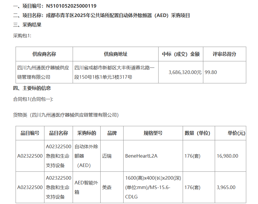 四川九州通醫療器械供應鏈公司中標成都青羊區AED采購項目