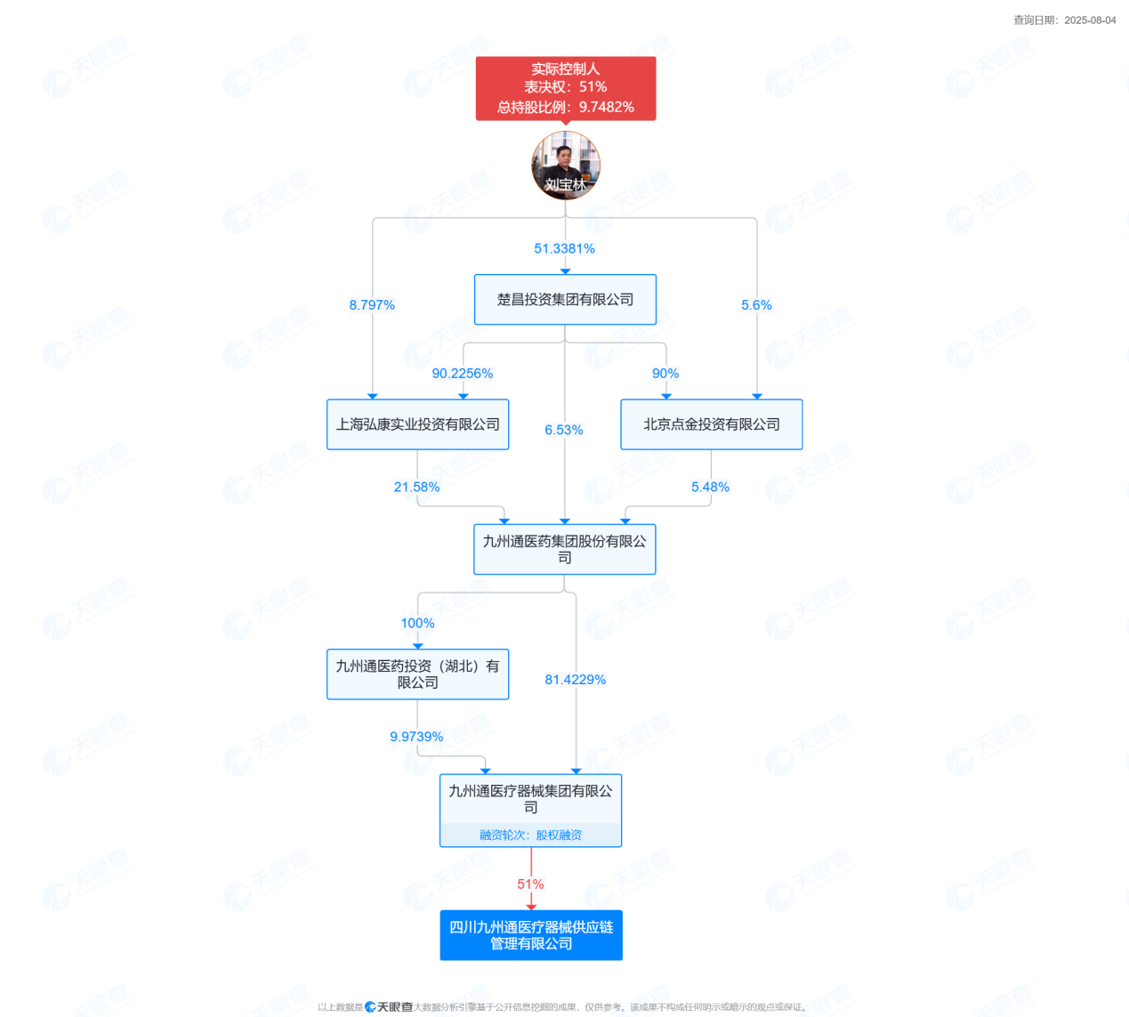天眼查顯示,四川九州通醫療器械供應鏈管理有限公司成立于2023年,注冊資本6000萬(wàn)元,是九州通醫藥集團股份有限公司孫公司,也系楚昌投資集團成員。