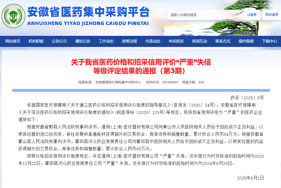 通報顯示,根據安徽省黟縣人民法院刑事判決書(shū),通用(上海)醫療器材有限公司向黃山市人民醫院相關(guān)人員給予回扣或不正當利益,以使其經(jīng)營(yíng)的進(jìn)口創(chuàng )傷類(lèi)、脊柱類(lèi)骨科高值耗材獲得額外的交易機會(huì )、競爭優(yōu)勢和銷(xiāo)售數量,累計折合人民幣54萬(wàn)元;按照價(jià)格招采信用評價(jià)制度規定,評定通用(上海)醫療器材有限公司“嚴重”失信,該失信行為時(shí)效標準的起始時(shí)間為20231222日。