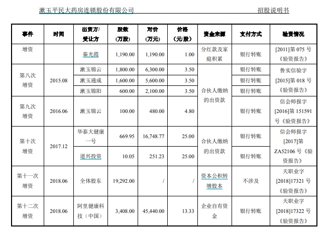 “V觀(guān)財報”查閱漱玉平民招股書(shū)發(fā)現,2018年6月,漱玉平民股東大會(huì )通過(guò)決議,同意將注冊資本增加至36480萬(wàn)元。新增的注冊資本3408萬(wàn)元由阿里健康以45440萬(wàn)元認繳,全部為貨幣出資。本次增資的價(jià)格為13.33元/股。