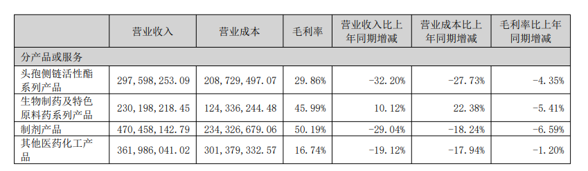 從具體業(yè)務(wù)板塊收入看,報告期內,除生物制藥及特色原料藥系列產(chǎn)品營(yíng)收實(shí)現正增長(cháng)外,金城醫藥頭孢側鏈活性酯系列產(chǎn)品、制劑產(chǎn)品、其他醫藥化工產(chǎn)品的營(yíng)收較上年同期均有回落。同時(shí),上述四大板塊產(chǎn)品的毛利率上半年均降低。