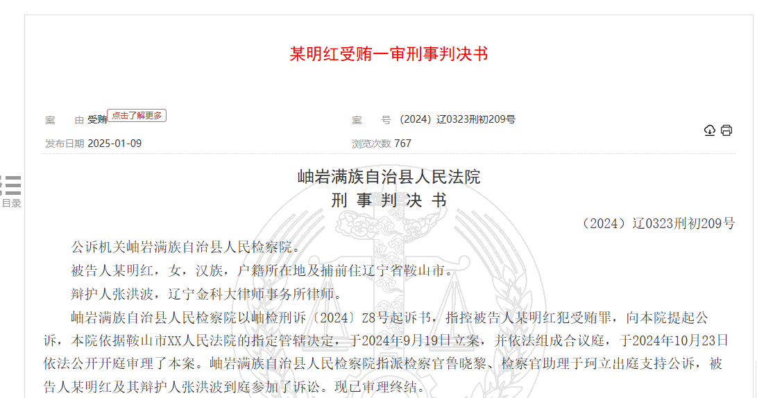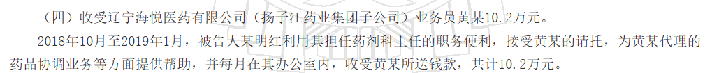 根據判決書(shū),2018年10月至2019年1月,被告人某明紅利用其擔任藥劑科主任的職務(wù)便利,接受遼寧海悅醫藥有限公司(揚子江藥業(yè)集團子公司)業(yè)務(wù)員黃某的請托,為黃某代理的藥品協(xié)調業(yè)務(wù)等方面提供幫助,并每月在其辦公室內,收受黃某所送錢(qián)款,共計10.2萬(wàn)元。