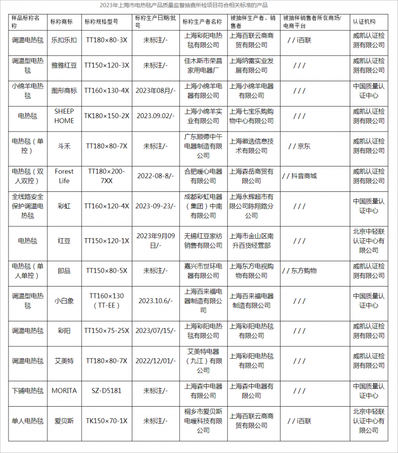 2023年上海市電熱毯產(chǎn)品質(zhì)量監督抽查結果