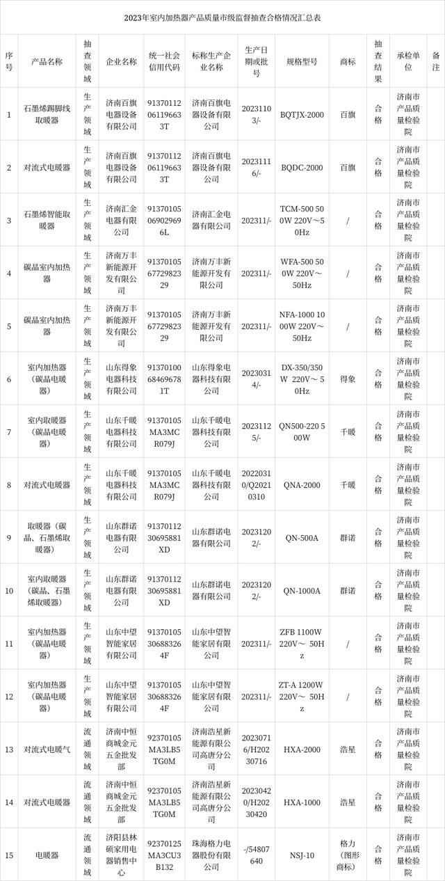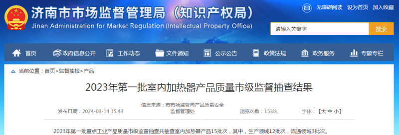 【濟南】2023年第一批室內加熱器產(chǎn)品質(zhì)量市級監督抽查結果