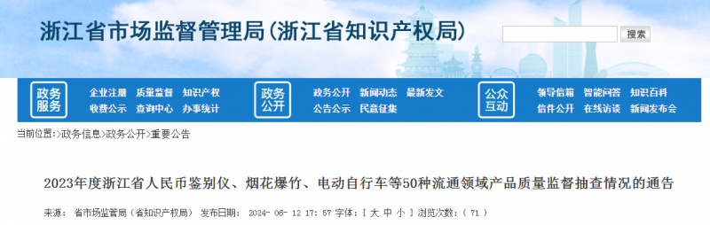 2024年6月12日,浙江省市場(chǎng)監督管理局網(wǎng)站發(fā)布2023年度浙江省人民幣鑒別儀、煙花爆竹、電風(fēng)扇、電動(dòng)自行車(chē)等50種流通領(lǐng)域產(chǎn)品質(zhì)量監督抽查情況的通告。