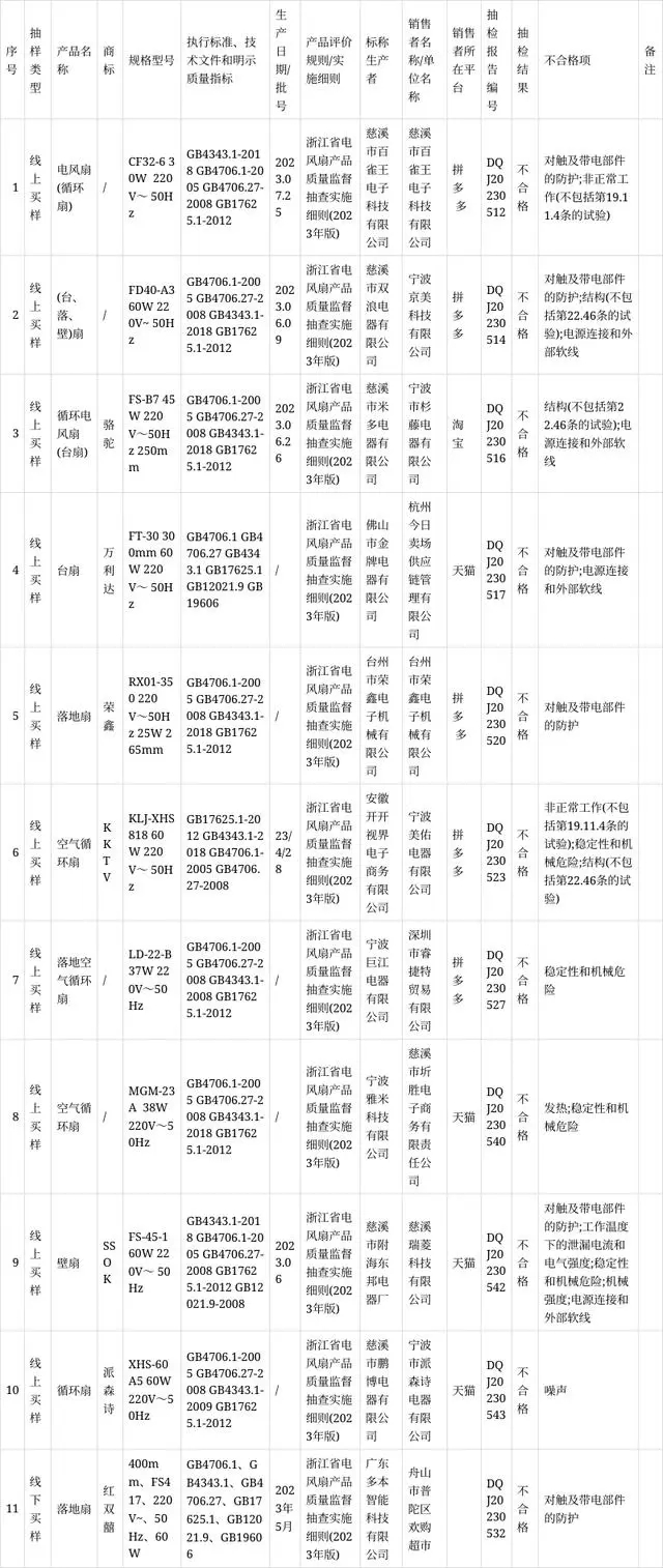 浙江省市場(chǎng)監督管理局發(fā)布40批次電風(fēng)扇產(chǎn)品監督抽查情況