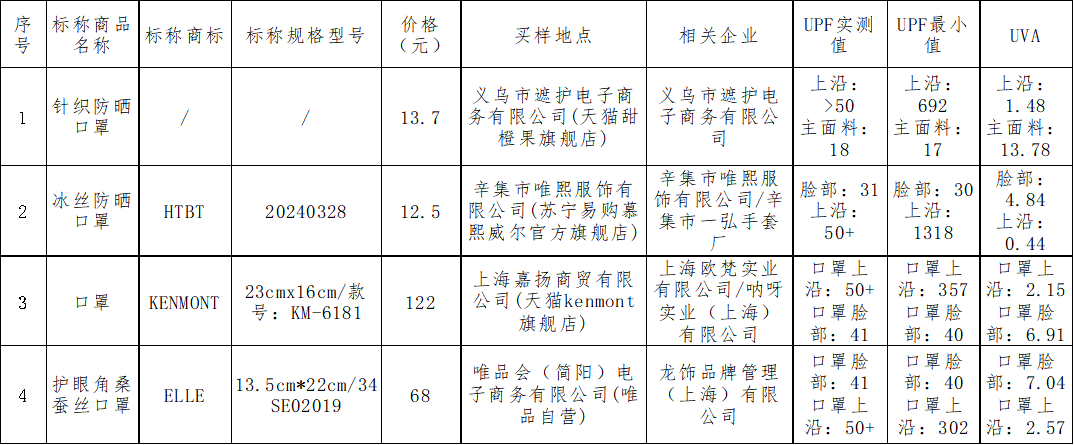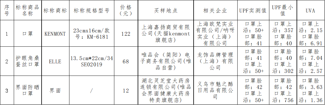 KENMONT、ELLE等3款樣品實(shí)測UPF值與明示或宣稱(chēng)不符