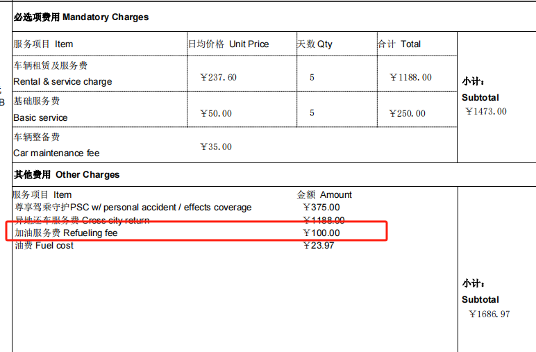 后來(lái),趙女士仔細查看神州租車(chē)的賬單,發(fā)現自己竟額外支付了123.97元。其中,23.97元為油費,100元是此前從未見(jiàn)過(guò)的“加油服務(wù)費”,趙女士立即聯(lián)系線(xiàn)上客服詢(xún)問(wèn)。