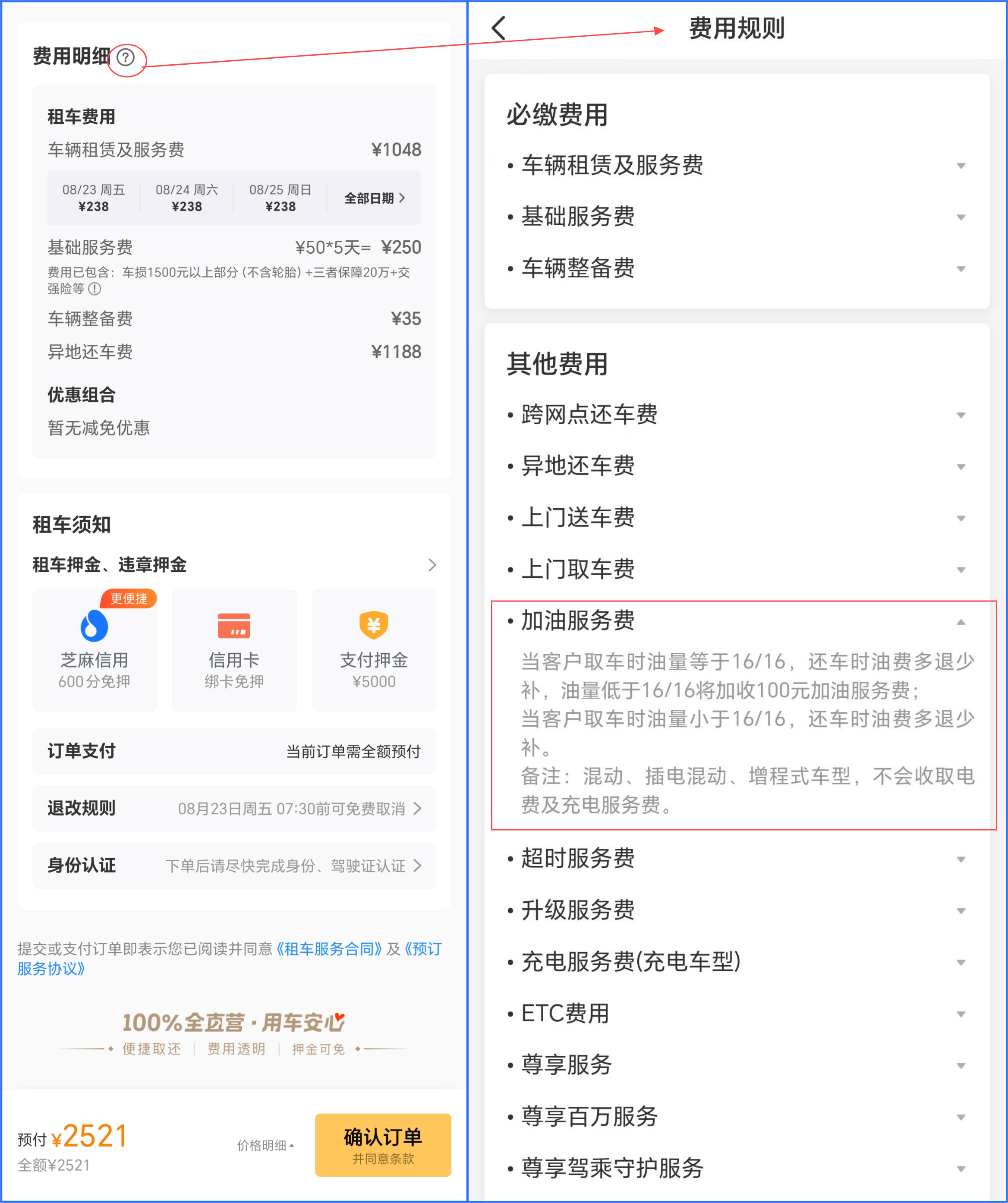 《中國消費者報》在神州租車(chē)APP上下單租車(chē),經(jīng)過(guò)仔細找尋,發(fā)現必須點(diǎn)開(kāi)“費用明細”旁邊一個(gè)不起眼的圓圈小問(wèn)號圖標后,才會(huì )跳轉至標注著(zhù)“費用規則”的清單。在“其他費用”一欄中包括了“加油服務(wù)費”,點(diǎn)開(kāi)后灰色小字顯示“當客戶(hù)取車(chē)時(shí)油量等于16/16,還車(chē)時(shí)油費多退少補,油量低于16/16將加收100元加油服務(wù)費”。