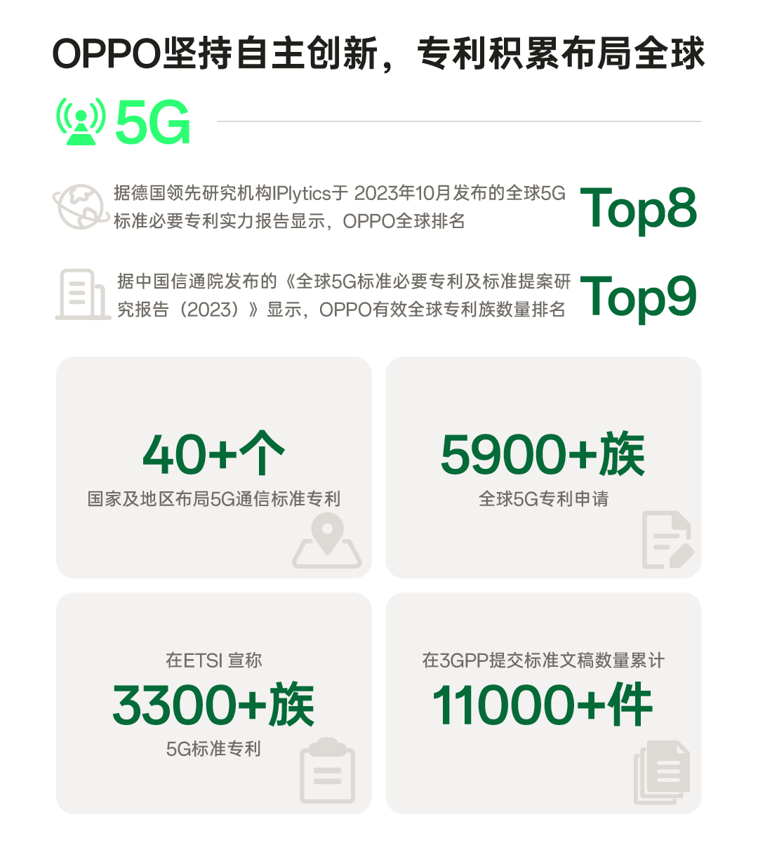 截至2023年12月31日,OPPO在全球40多個(gè)國家和地區布局5G通信標準專(zhuān)利,共完成5900+族全球專(zhuān)利申請,在ETSI聲明3300+族5G標準專(zhuān)利,在3GPP提交標準文稿數量累計超過(guò)11000件。根據中國信通院發(fā)布的《全球5G標準必要專(zhuān)利及標準提案研究報告(2023)》和IPlytics 在2023年10月發(fā)布的《全球5G標準必要專(zhuān)利實(shí)力報告》,OPPO 5G標準必要專(zhuān)利實(shí)力全球綜合排名均位居前列。