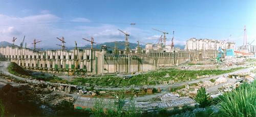 2001年8月拍攝的三峽工程電站廠(chǎng)房和泄洪壩段全景圖。新華社記者杜華舉攝