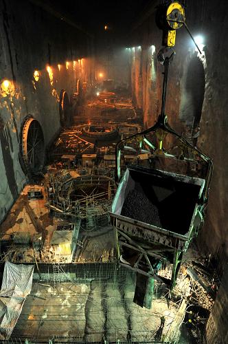 正在建設中的三峽工程地下電站內景(2009年3月26日攝)。目前,三峽工程的樞紐和輸變電工程已基本完工,運行平穩,綜合效益日益顯現。2009年6月30日,三峽電站26臺機組首次實(shí)現全部同時(shí)并網(wǎng)發(fā)電。