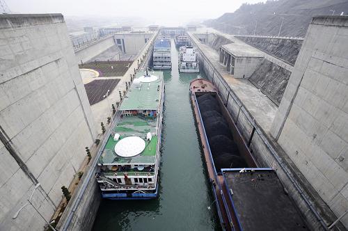 2008年2月23日,船舶在三峽船閘閘室內等待過(guò)閘。2009年6月17日,三峽船閘安全穩定通航6年,發(fā)揮了巨大的通航效益。截至6月底,三峽船閘累計運行近5萬(wàn)閘次,過(guò)閘貨運量突破3億噸。新華社記者杜華舉攝