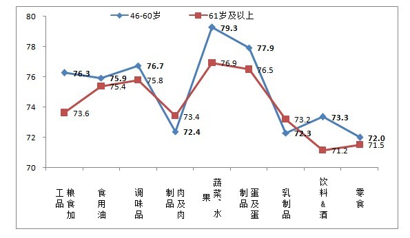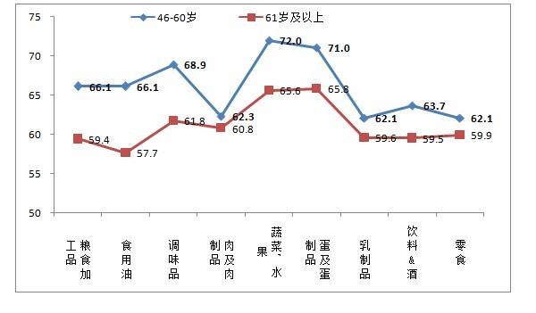 進(jìn)一步分析46歲以上市民對食品安全現狀擔憂(yōu)的食品領(lǐng)域,46-60歲市民對肉及肉制品、乳制品、飲料&酒和零食的安全信心指數評價(jià)較低,直接拉低他們目前對食品安全的放心程度。61歲以上市民目前對九大類(lèi)食品的安全信心指數都偏低,除蔬菜水果和蛋及蛋制品外,其它食品的信心指數都低于65。