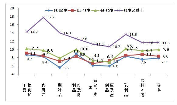 雖然年齡較大的市民對目前以及未來(lái)的食品安全信心比較不樂(lè )觀(guān),但是他們對于九大類(lèi)食品未來(lái)安全信心指數的增長(cháng)抱有很大的期望,尤其是61歲以上的市民,其中他們對食用油、糧食加工品、調味品和乳制品的信心增長(cháng)最為樂(lè )觀(guān)。