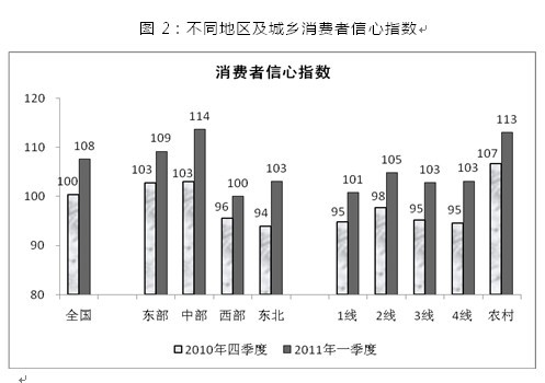 2011年一季度中國消費者信心指數為108,比2010年四季度上升8點(diǎn)。潘建成表示,中部地區的消費者信心...