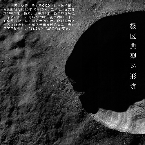 北京,2010年11月8日 國家國防科技工業(yè)局首次發(fā)布嫦娥二號月面虹灣局部影像圖 這是極區典型環(huán)形坑(成像時(shí)間為10月25日)。