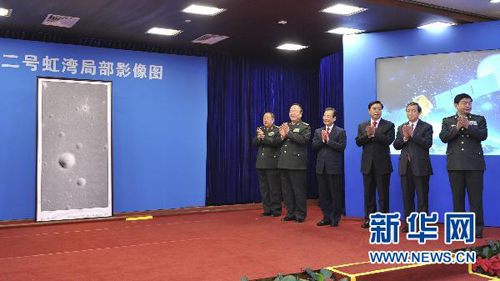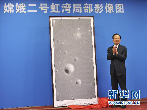 11月8日,探月工程嫦娥二號月面虹灣局部影像圖揭幕儀式在北京舉行,中共中央政治局常委、國務(wù)院總理溫家寶出席揭幕儀式并為影像圖揭幕。(新華社記者 黃敬文/攝)