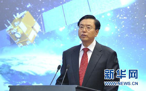 11月8日,探月工程嫦娥二號月面虹灣局部影像圖揭幕儀式在北京舉行,中共中央政治局常委、國務(wù)院總理溫家寶出席揭幕儀式并為影像圖揭幕。這是中共中央政治局委員、國務(wù)院副總理張德江宣讀《中共中央 國務(wù)院 中央軍委對探月工程嫦娥二號任務(wù)取得圓滿(mǎn)成功的賀電》。(新華社記者 黃敬文/攝)